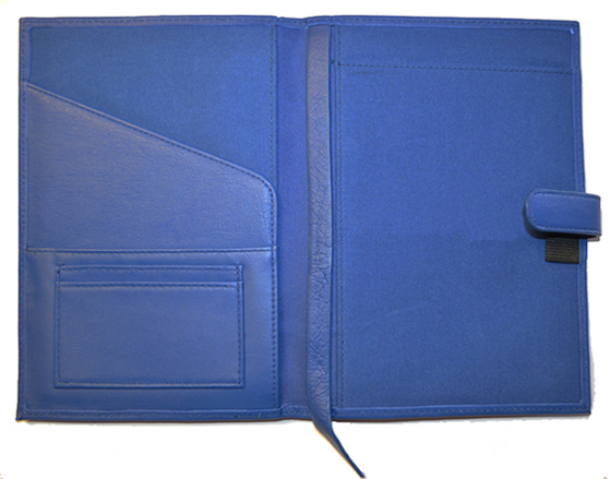 Description: Premium full-grain leather with sewn-in leather page marker and elastic pen loop. Tab closure. Inside slots and pockets for notes and business cards. A 5" x 8" ivory pad is included.