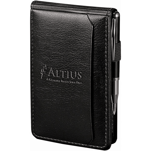 Description: Includes solar calculator. Elastic pen loop (no pen included). Front cover business card pocket. 3" x 4" blank writing pad.