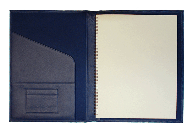 Description: Completely hand stitched and turned edges, with foam-padded genuine leather covers. Pen slot, interior pockets, and a document flap. Both top-loading and side-loading slots on the right pocket.