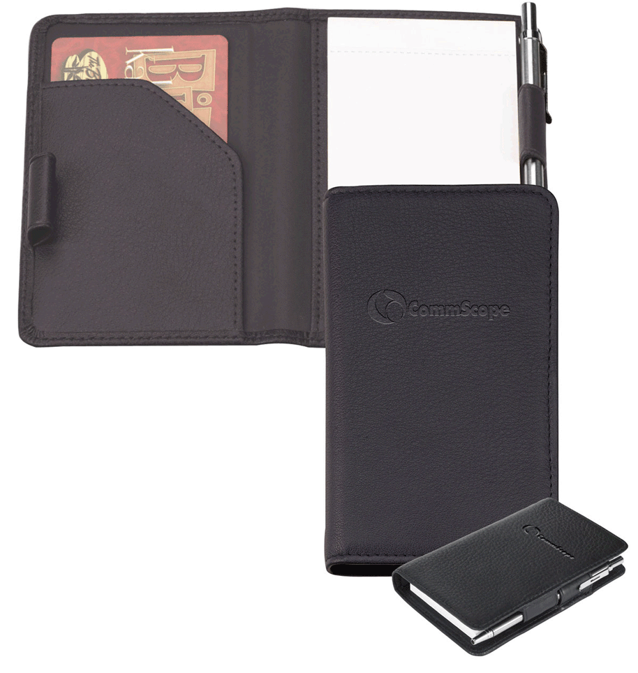 Description: Made of Velvet Touch Cowhide material. Has an interior card pocket. Dual pen loops provide closure when pen is threaded through both (slim metal pen included). Blank pad included.
