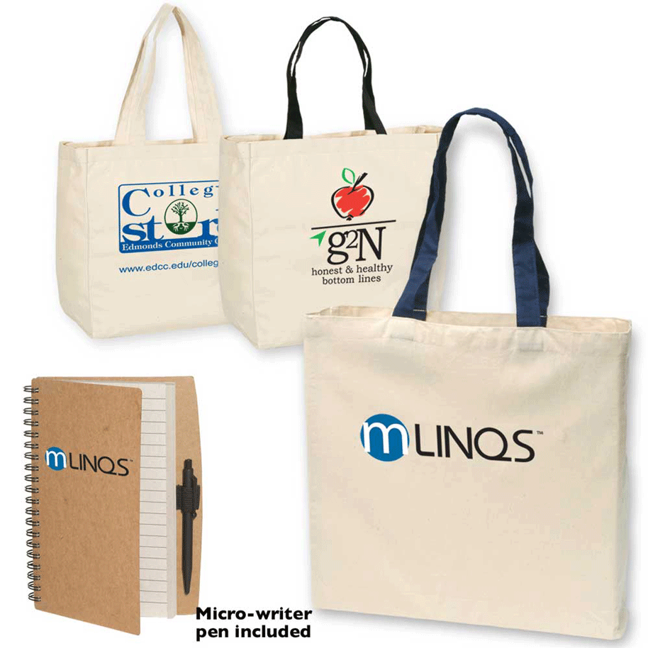 Description: Tote made from high-quality 6 oz. cotton canvas, with shoulder-length, sewn handle made of natural, canvas fiber. Notebook includes 60 pages of ruled, recycled 5" x 7" paper along with a 4" plastic pen, and an elastic pen loop. Notebook has a cardboard cover made from recycled paper and double metal loop wire binding.